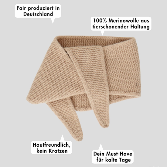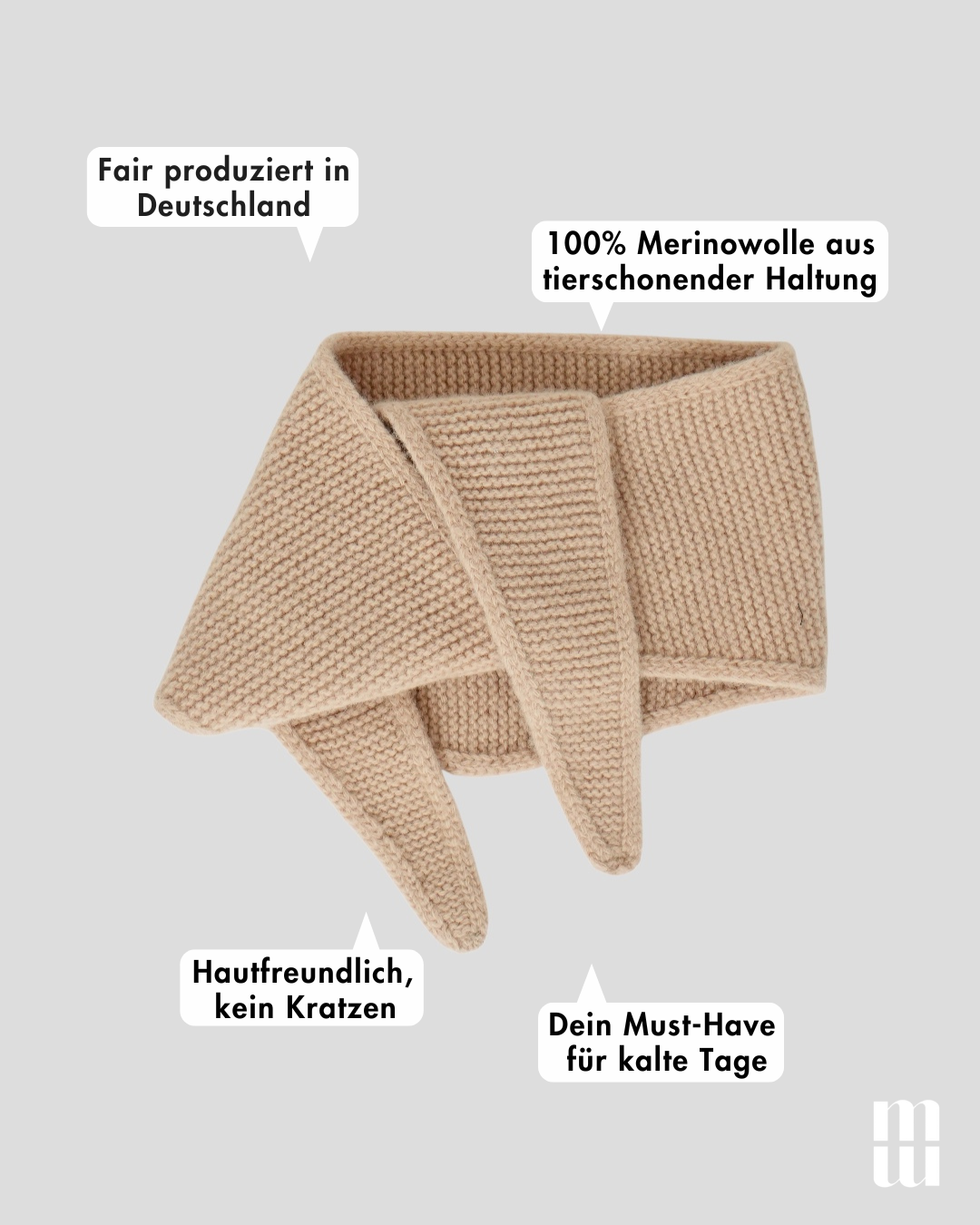Weich, stilvoll und fair: Unser Mini Scarf aus 100% mulesingfreier Merinowolle wird in Deutschland nachhaltig gefertigt. Das Design verleiht jedem Outfit einen gewissen Touch – egal ob casual oder chic.