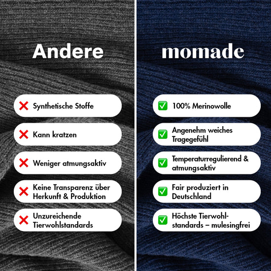 Unsere Mützen und Schals bestehen aus mulesingfreier Wolle – einer nachhaltigen Wahl für alle, die Mode mit Verantwortung tragen möchten. Diese Wolle stammt aus tierfreundlicher Haltung, bei der auf das schmerzhafte Mulesing verzichtet wird. Gleichzeitig überzeugt sie durch natürliche Eigenschaften: Sie ist biologisch abbaubar, langlebig, temperaturregulierend und besonders weich. Mit jedem unserer Produkte entscheidest du dich bewusst gegen Tierleid und für eine ressourcenschonende Alternative – für ein gutes Gefühl beim Tragen und einen positiven Beitrag zur Umwelt.