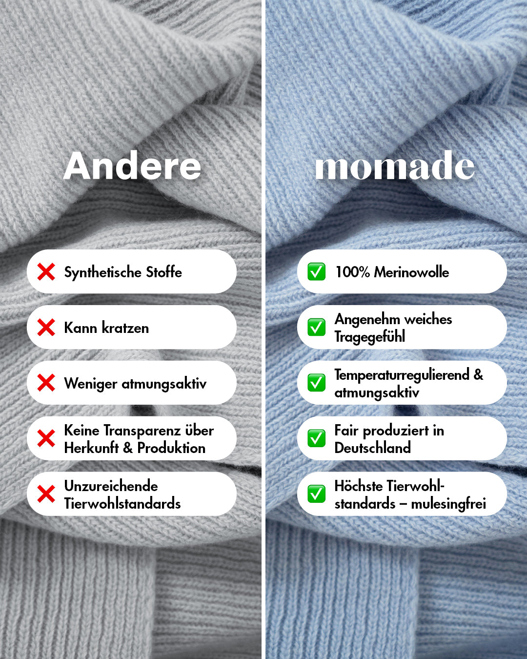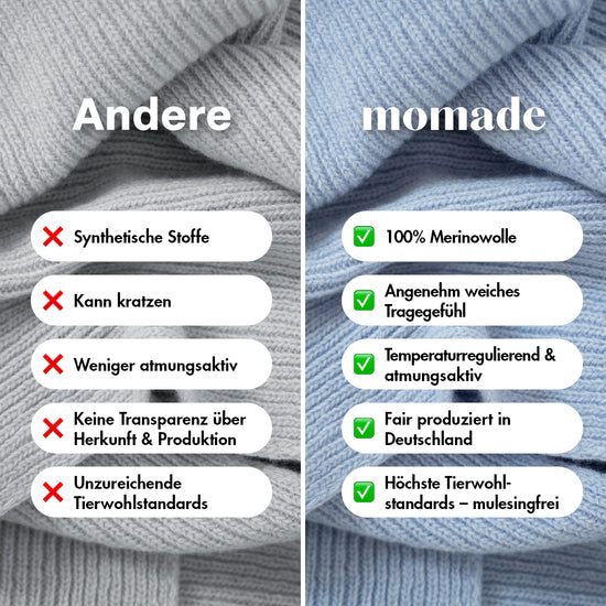 Unsere Mützen und Schals bestehen aus mulesingfreier Wolle – einer nachhaltigen Wahl für alle, die Mode mit Verantwortung tragen möchten. Diese Wolle stammt aus tierfreundlicher Haltung, bei der auf das schmerzhafte Mulesing verzichtet wird. Gleichzeitig überzeugt sie durch natürliche Eigenschaften: Sie ist biologisch abbaubar, langlebig, temperaturregulierend und besonders weich. Mit jedem unserer Produkte entscheidest du dich bewusst gegen Tierleid und für eine ressourcenschonende Alternative – für ein gutes Gefühl beim Tragen und einen positiven Beitrag zur Umwelt.